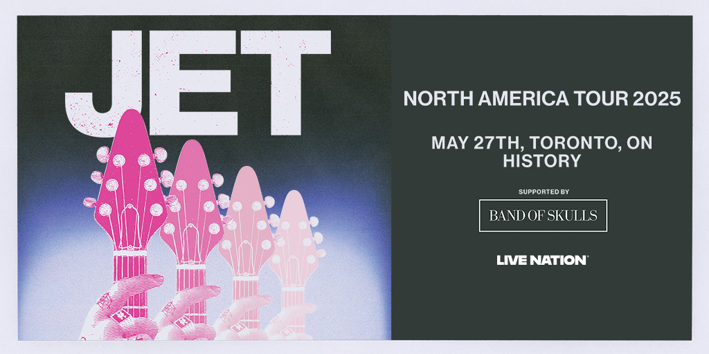 JET at History Where History, Toronto, ON Map When May 27/25 07:00 PM - May 27/25 11:00 PM Age All Website https://www.historytoronto.com/events/detail/jet Event Details Jet: JET NORTH AMERICAN TOUR 2025 with Band Of Skulls This is a 19+ event. Date 27 May 2025 Event Starts 8:00 PM Doors Open 7:00 PM On Sale Jan. 24 at 10:00 AM