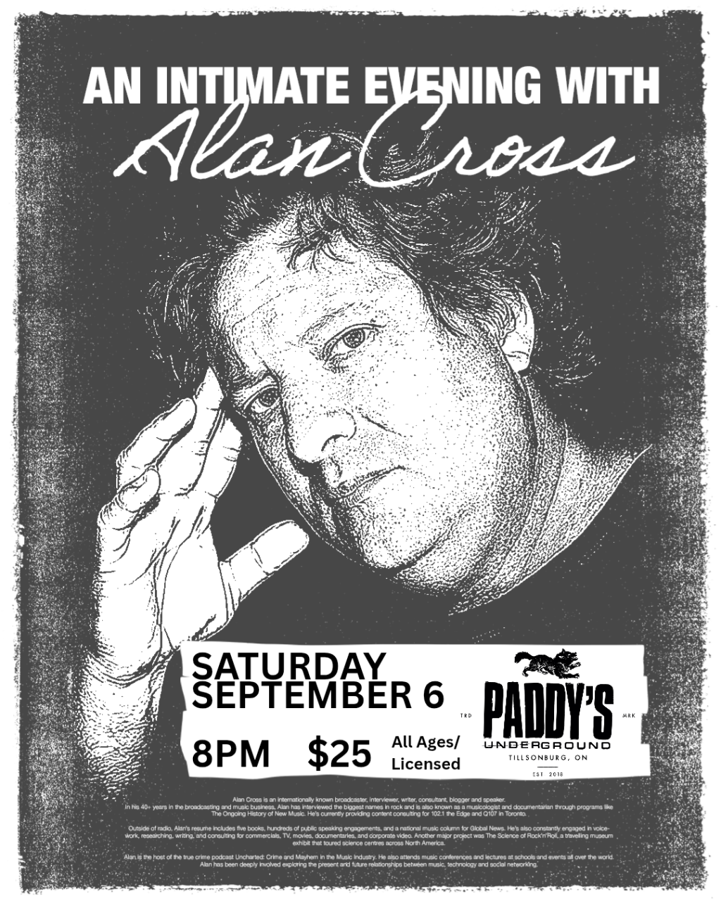 An Intimate Evening With Alan Cross – Live in Tillsonburg! Where Paddy's Underground, 20 John Pound Road, Tillsonburg, ON, N4G 0B9 Map When Sep 06/25 08:00 PM - Sep 06/25 10:30 PM Age All Website https://www.paddysunderground.com/ Alan Cross returns to Paddy’s Underground for another intimate evening of stories, Q+A and the On Going History of New Music. CLICK HERE FOR TICKETS AND DETAILS