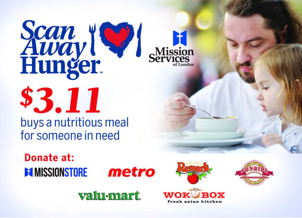 Our Scan Away Hunger™ Campaign runs throughout November and December each year at participating stores in London. It’s a vital way to support our clients given that approximately 200,000 meals are served yearly through three of our five branches.