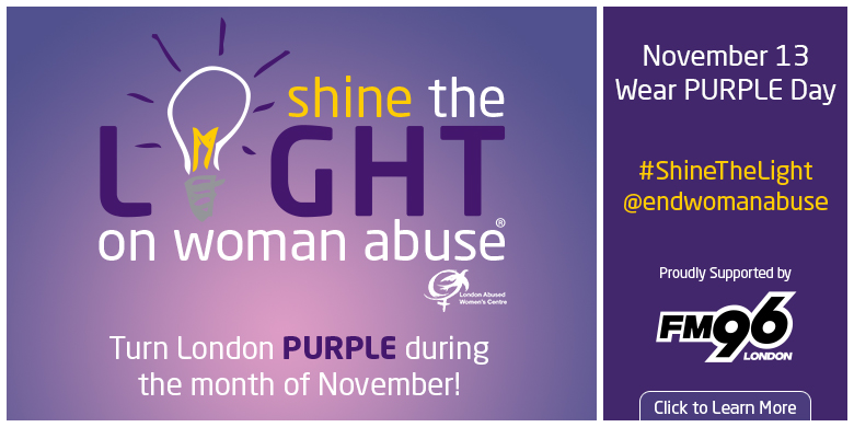 The goals of the Shine the Light on Woman Abuse campaign are to raise awareness of men’s violence against women by turning communities purple for the month of November. Purple is a symbol of courage, survival and honour, and has come to symbolize the fight to end woman abuse.