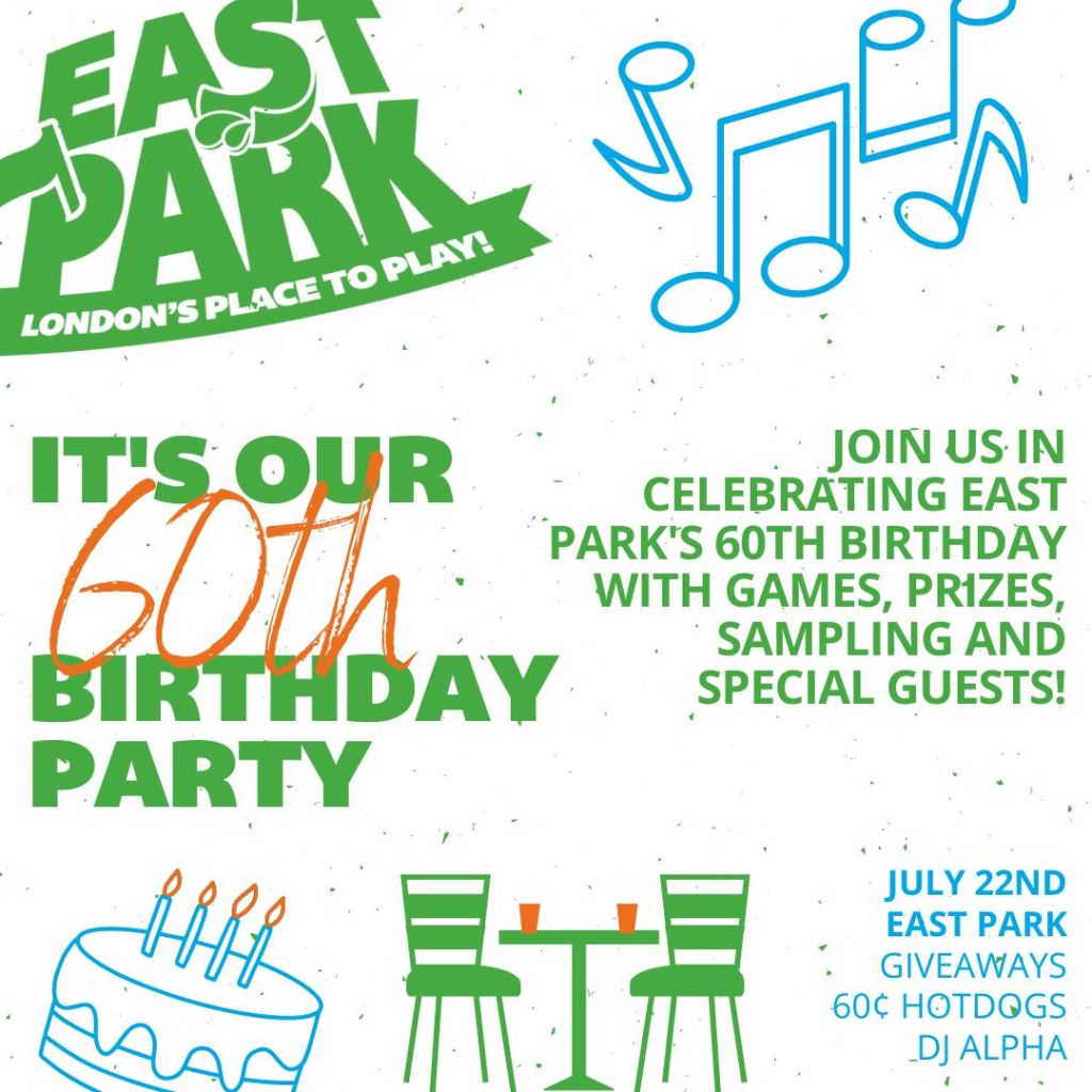 Join us at East Park as we celebrate 60 incredible years! On July 22, 2023, enjoy a day filled with thrilling competitions, live DJ in the waterpark, and special guests from the London Knights and Toronto Maple Leafs. Prizes, surprises, and unforgettable memories await. Save the date and be part of this momentous anniversary celebration!