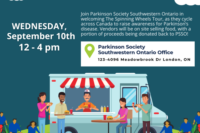123-4096 Meadowbrook Dr, London Join Parkinson Society Southwestern Ontario in welcoming The Spinning Wheels Tour as they cycle across Canada to raise awareness for Parkinson’s disease Vendors will be on site selling food with a portion of proceeds being donated back to PSSO!