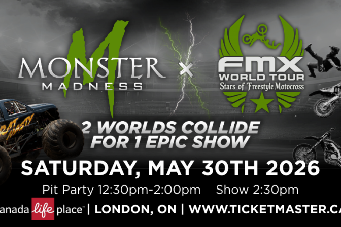 Canada Life Place, London Monster Madness x FMX World Tour – 2 Worlds Collide for 1 Epic Show! Get ready for an adrenaline-fuelled afternoon as Monster Madness teams up with the FMX World Tour: Stars of Freestyle Motocross for one massive, high-octane event! 📅 Date: Saturday, May 30, 2026📍 Location: Canada Life Centre, London, ON🎉 Pit Party: 12:30pm – […]